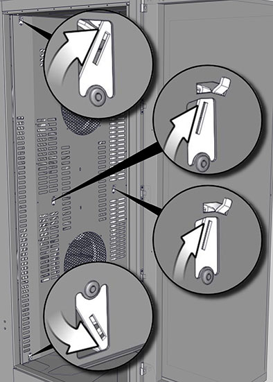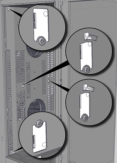 Überprüfen Sie, ob alle vier Verschlüsse (oben, Mitte, unten) verriegelt sind. Bei der Modellgröße 12.20 sind es nur zwei Verschlüsse (oben und unten). |