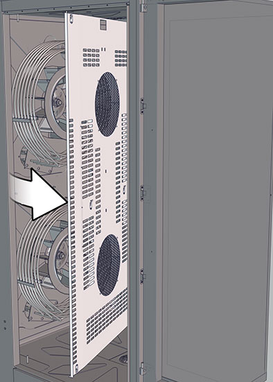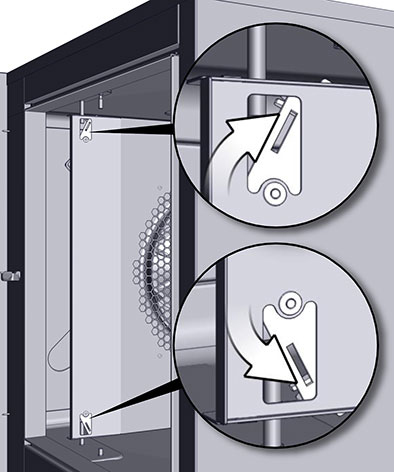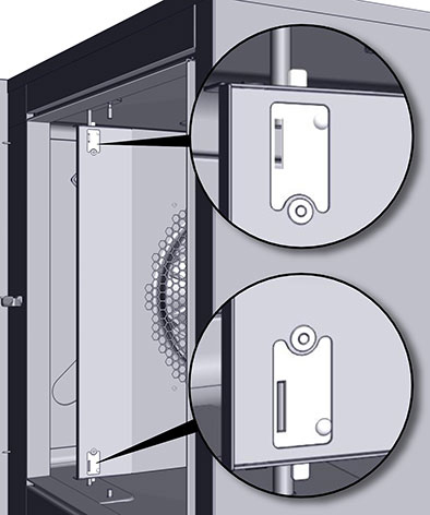 Entriegeln Sie die vier Verschlüsse (oben, Mitte, unten) des Ansaugblechs mit dem Werkzeug. Bei der Modellgröße 12.20 sind es nur zwei Verschlüsse (oben und unten). |